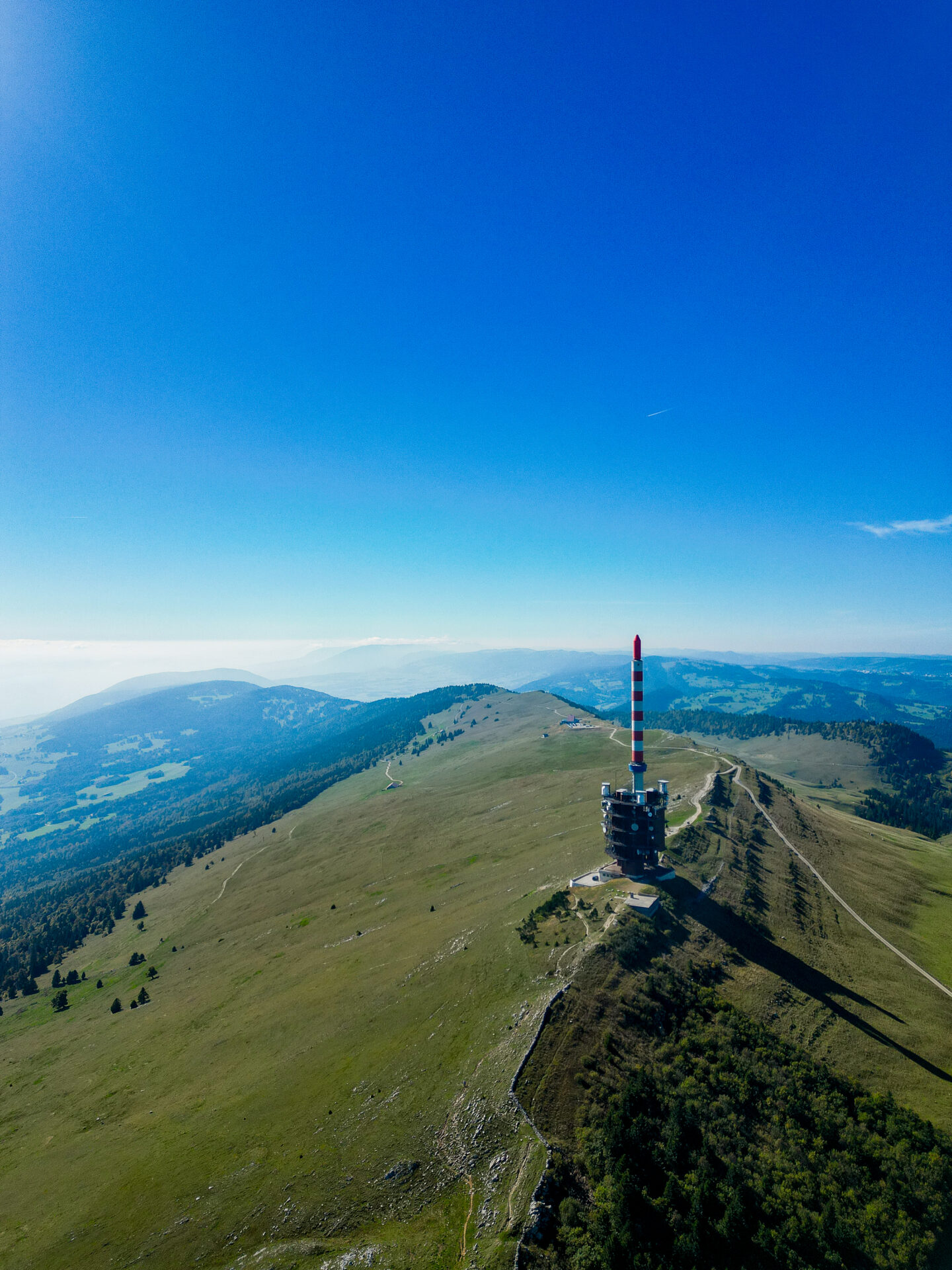 🚸 La montée au Chasseral mène jusqu’à sa tour emblématique perchée à 1 606 m d’altitude, surmontée d’une antenne de 120 m. Depuis le sommet, on profite d’un panorama unique à 360° sur les lacs de Neuchâtel, Bienne et Morat, le Jura, le Plateau suisse et, par temps clair, toute la chaîne des Alpes.